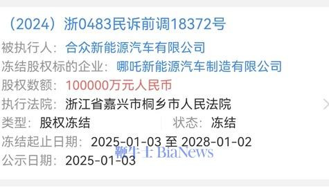 鞭牛士1月6日音书,据天眼查披露,哪吒汽车母公司合众新动力汽车有限公司近日新增一条股权冻结信息,股权被施行的企业为哪吒新动力汽车制造有限公司,冻结股权数额10亿东说念主民币,冻结期限自2025年1月3日至2028年1月2日,施行法院为浙江省嘉兴市桐乡市东说念主民法院。