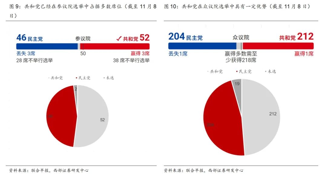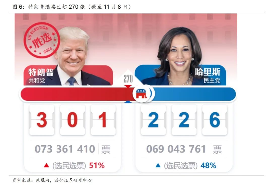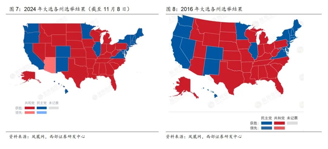2024年好意思国大选靴子落地,共和党以较大开首赢得得胜。当地时候11月5昼夜深,凭据多家好意思国媒体初步测算,好意思国共和党总统候选东说念主特朗普赢得总统选举。铁心11月8日,尽管仍有少数选票尚未统计完成,但共和党也曾说明赢得了301张选举东说念主票,而且在重要的七大扭捏州沿途保捏开首地位,以超出预期的显贵上风赢得了本次大选,上风以致高于2016年。而跟着民主党候选东说念主哈里斯秘书承认竞选失败,这预示着两党将以和平的步地顺利完成权力派遣,雷同于2020年大选特朗普阻隔给与选举罢了的风险事件再次发生的概率缩小。