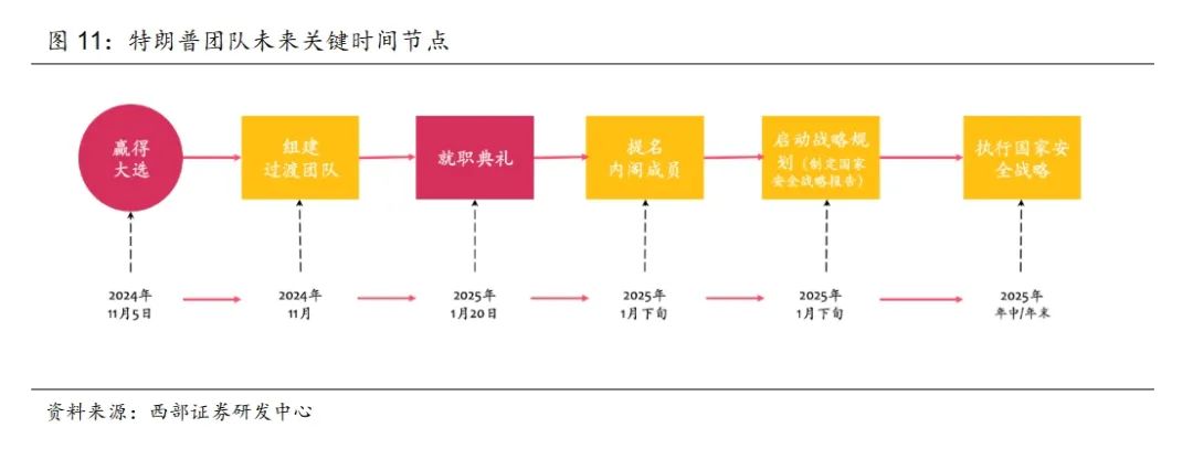 特朗普得胜后,后续需要慈祥新政府开荒进度。因为本次大选完结后两党将以和泛泛式完成职权派遣,因此咱们需慈祥后续特朗普团队的往时重要时候节点。当前来看,特朗普也曾启动“过渡团队”(Transition team)的组建,往时一段时候特朗普会就各个重要岗亭口试海量的潜在候选东说念主。当前特朗普也曾发达任命苏珊·萨默罗尔·威尔斯担任往时的白宫办公室主任,这亦然第一个发达说明的特朗普第二任期内阁要职(除副总统万斯外)。按照常规,过渡团队组建后便将会与拜登政府团队进行派遣。2025年1月20日,特朗普将发达接替拜登并举行赴任仪式。赴任仪式完结后,特朗普将会立即向酌量院提交国务卿等重要岗亭的候选东说念主。由于酌量院届时也曾为共和党适度,特朗普的提名的梗阻预期相对较小。如酌量院缓缓说明提名后,特朗普政府中枢班子将会发达就位。
