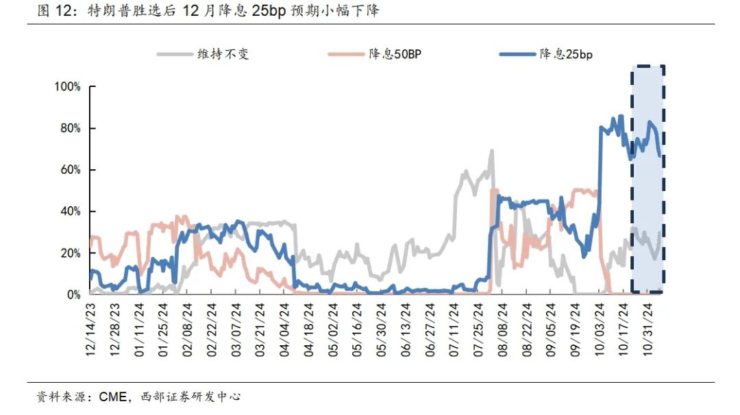咱们以为,特朗普的减税以及关税改造或会进一步晋升通胀水平,这将对好意思联储往时的降息旅途酿成一定影响。而从CME预期数据来看,在好意思国大选前的11月5日,CME押注到12月降息25bp概率为77.3%,而在特朗普胜选后,CME对12月降息预期下落至69.9%,但预期仍然处于高位。