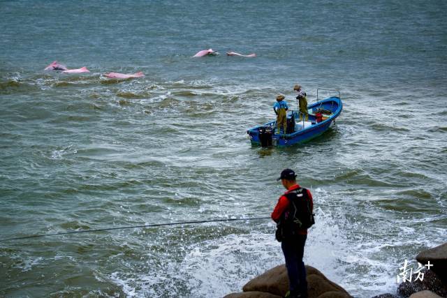 坐标东平海域,钓手、渔民、6头白海豚同框“合影”