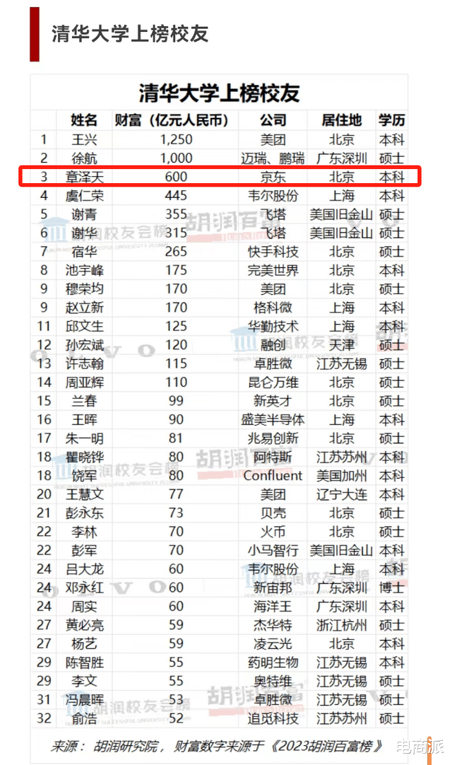 2024年,胡润究诘院发布《胡润学友会榜》,在学友会榜中,在清华大学上榜学友的名单中,章泽天在列,以净资产600亿的身家在清华优秀学友中名轮番三。