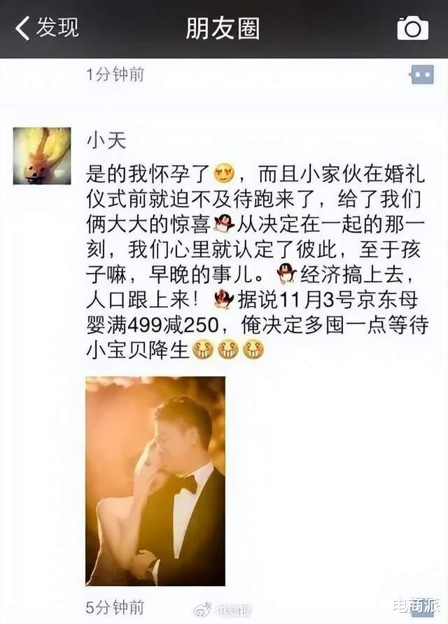 2015年章泽天在一又友圈官宣怀胎时,顺遂就给京东打了个告白:“经济搞上去,东谈主口跟上来!传说11月3日京东母婴满499减250,俺决定多囤少许恭候小宝贝降生。”