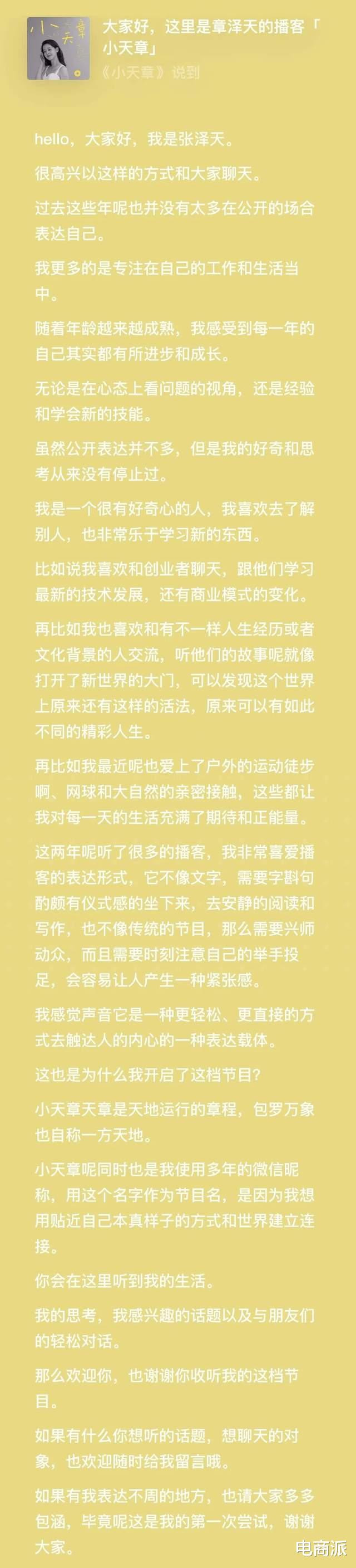 新年开端,奶茶妹妹章泽天躬行下场作念播客,开小红书账号运营。近日其在播客平台小世界平台通达个东谈主账号,并取名“小天章”,首期节目是时长不到3分钟的自我先容,节目播出1小时,收听量已破万。