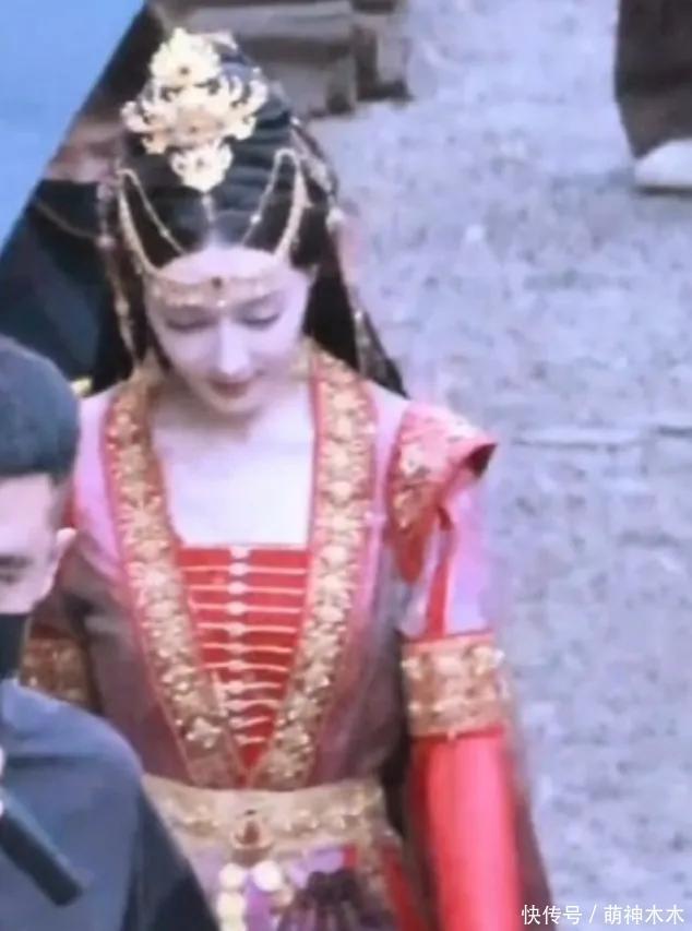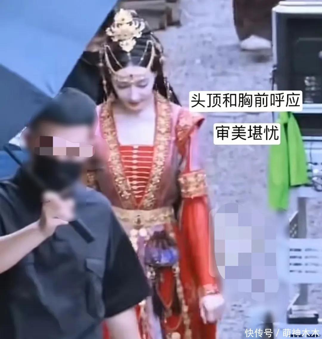 热巴的妆造主打一个普及高度不普及宽度的本性,发冠的存在更是在视觉实现上起到了拉长的作用,头顶的金色发冠和胸前一条一条的金链相呼应,不仅莫得起到相反相成的作用,还让本就陈腐的妆容更显低价。
