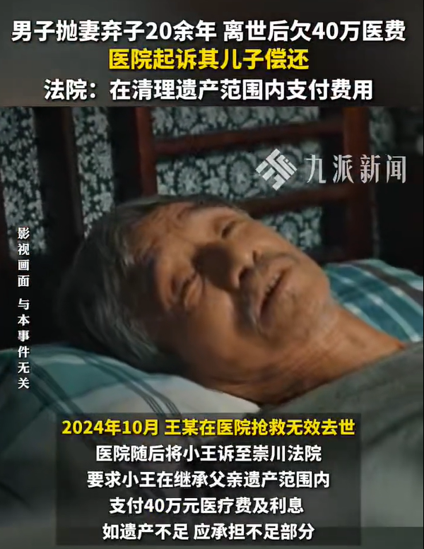 2024年10月,王某在病院抢救无效厌世。病院随后将小王诉至崇川法院,条目小王在罗致父亲遗产界限内支付40万元医疗费及利息,如遗产不及,快活担不及部分。