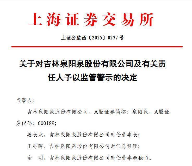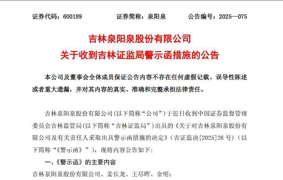 12月18日,泉阳泉(600189)发布公告,近日收到中国证券监督惩处委员会吉林监管局和上交所出具的警示函。