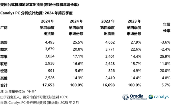 值得一提的是,在2024年第四季度,苹果得胜罕见联念念,跃升至第三位,这是自2022年第三季度以来的初次防止。分析师Davis指出:“苹果的Mac出货量在好意思国同比增长26%,第四季度出货量防止300万台。Windows换代周期为苹果创造了有意的市集机会,诱骗了那些可能自得更换操作系统的粉碎者和企业。往时,可料感性和兼容性问题一直是大型商用客户躲避苹果居品的主要原因。然则,苹果照旧贬责了诸多问题,再加上其更具竞争力的订价政策以及下半年对渠谈连联合伴计较的改革MK体育,瞻望2025年Mac将在商用市荟萃斩获更多的市集份额。”